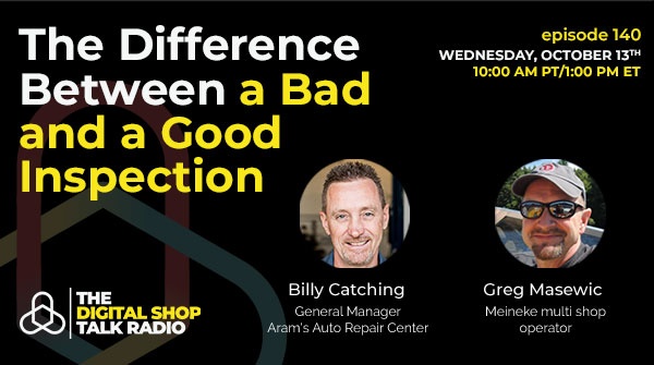 Good morning, good afternoon. I’m Bill Connor and if you’re listening live, you’ve reached the Digital Shop Talk Radio. If you’re listening afterwards, you’ve listened or you’ve come to the same place, if you’d like to join us live, look for AutoVitals.com/radio and just register and you’ll get a reminder saying to come in and join us. We always prefer those that go ahead and join us live to chat their questions in as we go along. We’d be happy to go ahead and answer those live that actually pertain to the topic of the day. So today I’m here with Billy Catching the general manager of Aram’s Auto Repair Center. Been here many times on similar topics for sure. Always a good person to have on this. And Greg Masewic, he’s a operator of multiple Meineke Car Care Centers, so that would explain why he’s pulled out most of his hair.